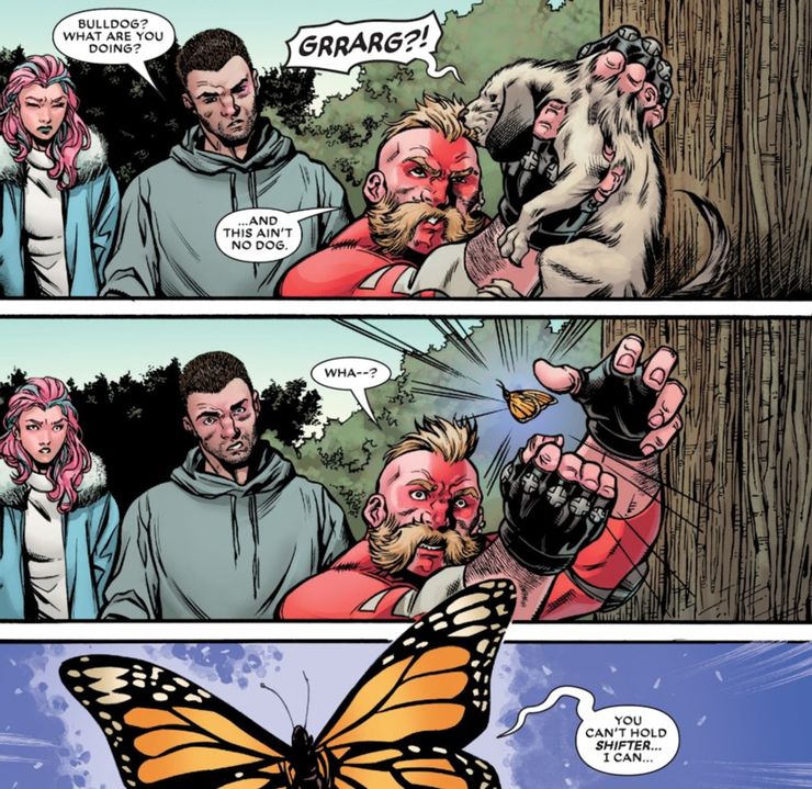 En la escena de la desaparición, Bulldog revela su inusual habilidad cuando ve a un perro callejero observando al equipo. Mientras el resto de la Unión está ocupado discutiendo, Bulldog agarra al callejero por el cuello y declara. “Está bien, chicos, creo que tenemos un problema. Créanme, conozco a mis perros … y este no es un perro”. Fiel a las afirmaciones de Bulldog, el perro de repente se convierte en una mariposa antes de atacar al equipo en varias formas animales, revelándose como el villano cambiaformas Shifter; un miembro de la pandilla del archivillano Doc Croc enviado para espiar a los héroes.