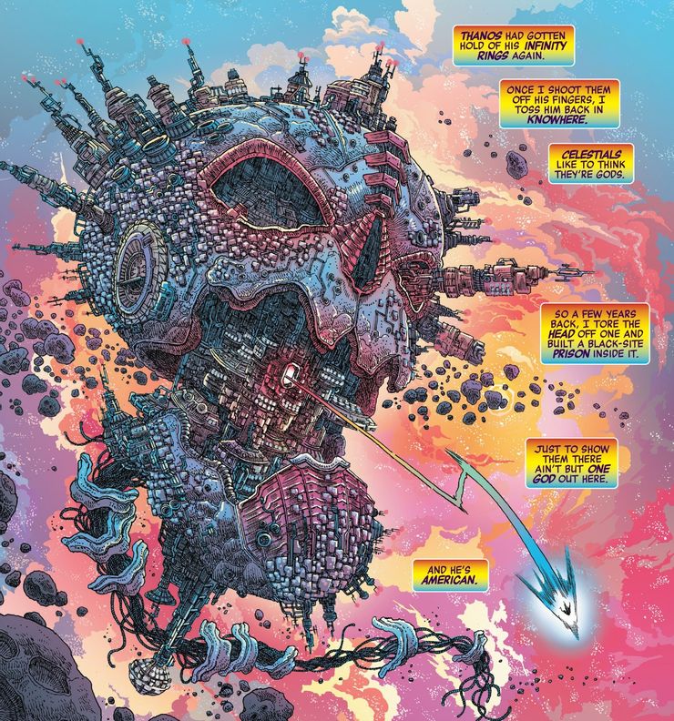 En Héroes renacidos # 4 por Jason Aaron y James Stokes, los lectores pueden vislumbrar lo poderoso que se ha vuelto Doctor Spectrum. Después de soplar los Anillos Infinitos de la mano de Thanos, los coloca en la ubicación familiar de Knowhere. Mientras que en el Universo Marvel principal y el MCU Knowhere es una ubicación antigua con orígenes misteriosos, aquí ese no es el caso. Al encontrar a los Celestiales demasiado engreídos, Spectrum le arrancó la cabeza a uno y luego la usó como prisión. Durante una pelea con Rocket Racoon, Spectrum también revela que pudo atrapar a Ego the Living Planet y colgarlo sobre un agujero negro, torturando a Ego. Como si todo eso no fuera suficiente, el problema también ve a Spectrum abriendo un agujero en el espacio y el tiempo para acribillar el cuerpo de Rocket con tumores antes de derretirlo en las llamas de una supernova.