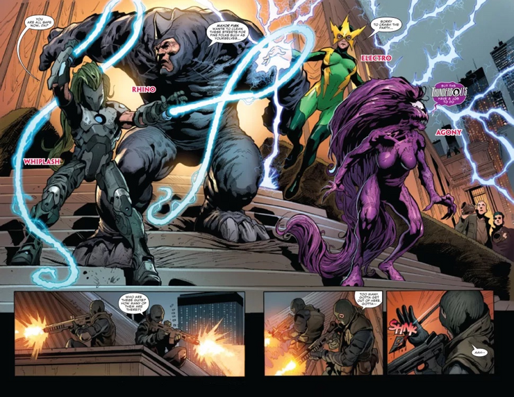 La primera orden del día de Fisk fue eliminar a todos los superhéroes que anteriormente se habían atrevido a desafiarlo. Al declarar que el “vigilantismo de superhéroes” es una amenaza para la seguridad del público, Fisk ordena el arresto de cualquier superhéroe dentro de los límites de la ciudad. Sin embargo, en lugar de depender de la fuerza policial, Fisk está creando un nuevo equipo de Thunderbolts de sus ejecutores seleccionados personalmente que incluye a Electro, Agony, Whiplash, Rhino y otros. Una vista previa reciente de Devil’s Reign: Villanos a sueldo #1 muestra que estos villanos ahora tendrán rienda suelta para combatir a los héroes de Nueva York.
