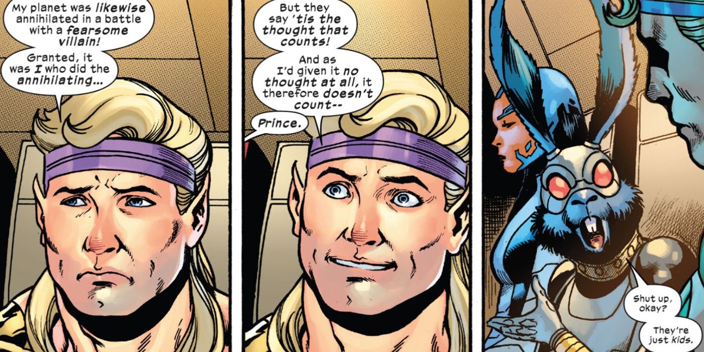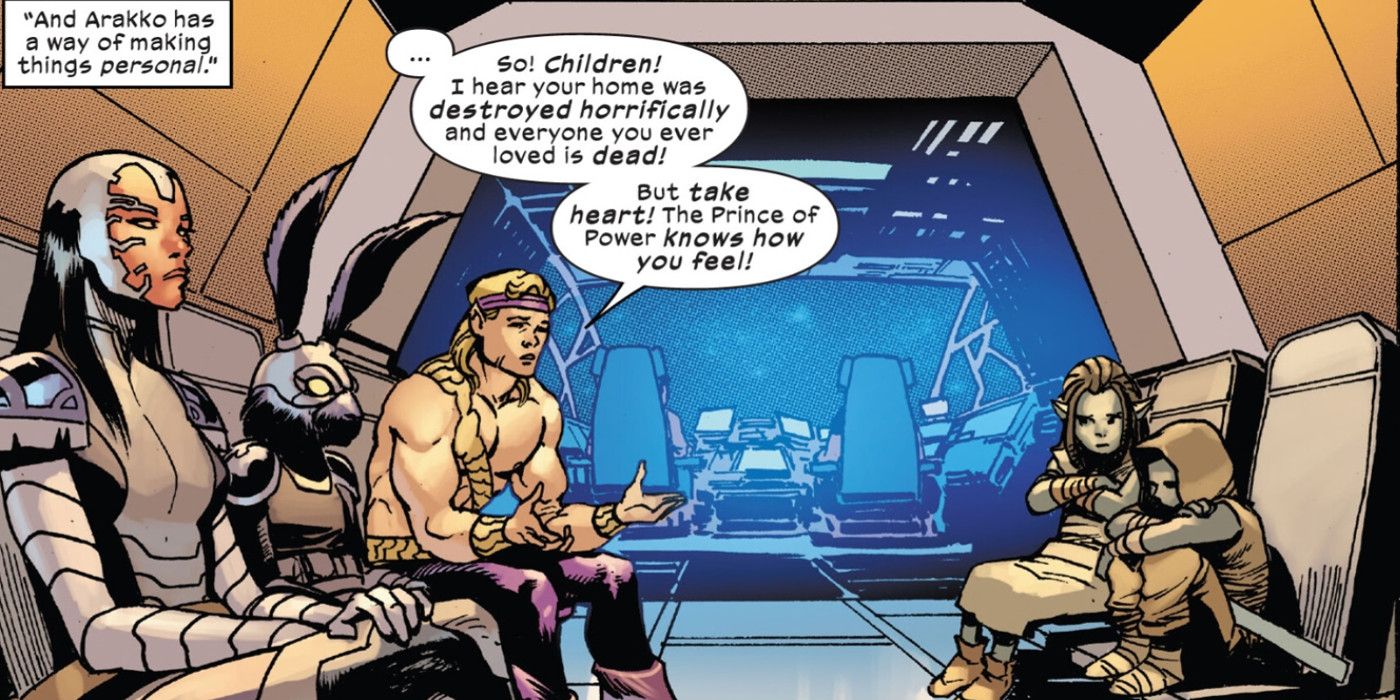 X-Men Rojo El número 16 está escrito por Al Ewing y dibujado por Yildiray Cinar. El Príncipe del Poder está a bordo de un barco que transporta refugiados de Arrako. Sentados frente a él hay dos pequeños niños Arrakkii, que acaban de perderlo todo. El Príncipe del Poder les dice a los niños que sabe cómo se sienten, porque su planeta también fue destruido, pero fue él quien lo destruyó. El Príncipe del Poder hace caso omiso de este horrible hecho y dice: “’¡Es el pensamiento lo que cuenta! Y como no lo había pensado en absoluto, no cuenta..” Antes de que el Príncipe pueda continuar con esta audaz demostración de sordera, otro pasajero lo hace callar.