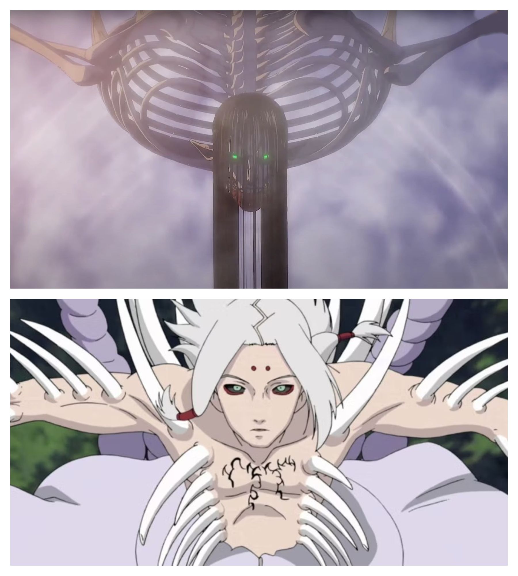 En naruto, La forma esquelética parecida a un ciempiés de Eren fue representada por Kimimaro, un discípulo de Orochimaru. La habilidad de Kimimaro fue heredada de Kaguya Otsutsuki, el fundador de su clan, al igual que Eren heredó su poder de Titán Fundador de Ymir. Algunos miembros del clan de Kimimaro heredaron algunos de los rasgos recesivos y poderes especiales de Kaguya. En el caso de Kimimaro, el rasgo se conoce como Shikotsumyaku, o los huesos de ceniza que todo lo matan. Le da a Kimimaro la capacidad de cambiar y adaptar su estructura ósea y esqueleto y usarlo como una extensión de su cuerpo. Cuando está en uso, el Shikotsumyaku de Kimimaro es similar al aspecto del Doomsday Titan de Eren, aunque en una escala mucho más pequeña y personal.