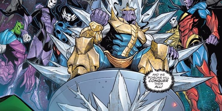 En el período previo a 2018 envenenado evento, los fans de Marvel conocieron a los Poisons, una raza alienígena depredadora que se alimenta de simbiontes como Venom y Carnage. Los venenos son bastante débiles por sí solos, pero pueden asimilar simbiontes y doblegarlos a su voluntad. Liderando a los venenos estaba otra versión de la realidad de Thanos: uno que había caído bajo la esclavitud de la verdadera Reina del Veneno después de que lo convenciera de que era una manifestación de su amada Muerte. Contra un ejército de héroes y villanos de universos alternativos infectados por Poison, los héroes de Marvel tuvieron que ponerse sus propios trajes de simbionte, mientras que Venom y los X-Men lideraron la carga para derrotar esta invasión.