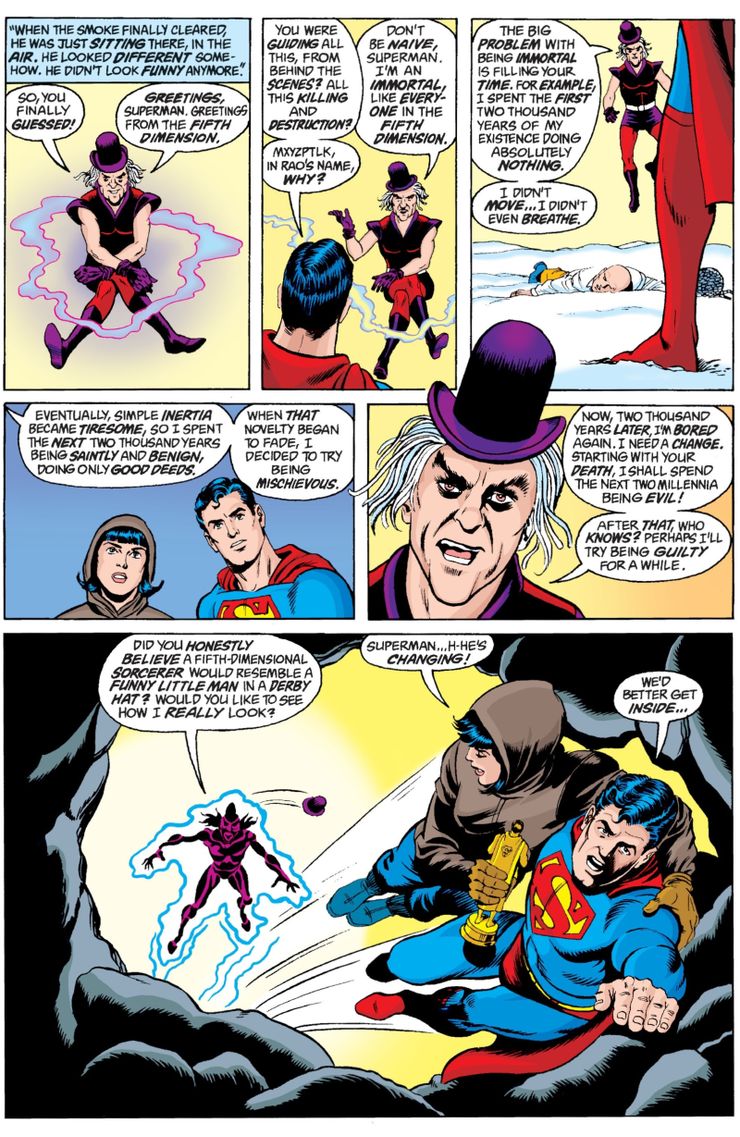 Aunque el Sr. Mxyzptlk generalmente no se considera una de las amenazas más peligrosas de Superman, su capacidad es similar a las que ofrece Marvel’s Infinity Gauntlet; de hecho, su energía mágica tiene menos restricciones. Mxyzptlk es un diablillo travieso y omnipotente de la Quinta Dimensión que puede hacer cualquier cosa imaginable, como lo hace Thanos con el Infinity Gauntlet. Alan Moore, Curt Swan, George Pérez y Murphy Anderson Superhombre #423 y Cómics de acción # 583 tenía la intención de contar la historia “final” de Superman del Superman de la Edad de Plata de DC Comics, justo antes Crisis en tierras infinitas cambió para siempre el multiverso. Estos dos temas, típicamente combinados como “¿Qué pasó con el hombre del mañana?” historia, muestra el verdadero potencial del Sr. Mxyzptlk. Hacia el final de la historia, el Sr. Mxyzptlk se revela como el villano detrás de toda la historia. Por primera y única vez en la historia de Superman, Mxyzptlk decide usar sus poderes para el mal puro en lugar de sus travesuras más típicas. Se convierte en una aberración púrpura y brillante sin esencia y persigue a Superman hasta la Fortaleza de la Soledad, intentando matar al Hombre de Acero de una vez por todas.