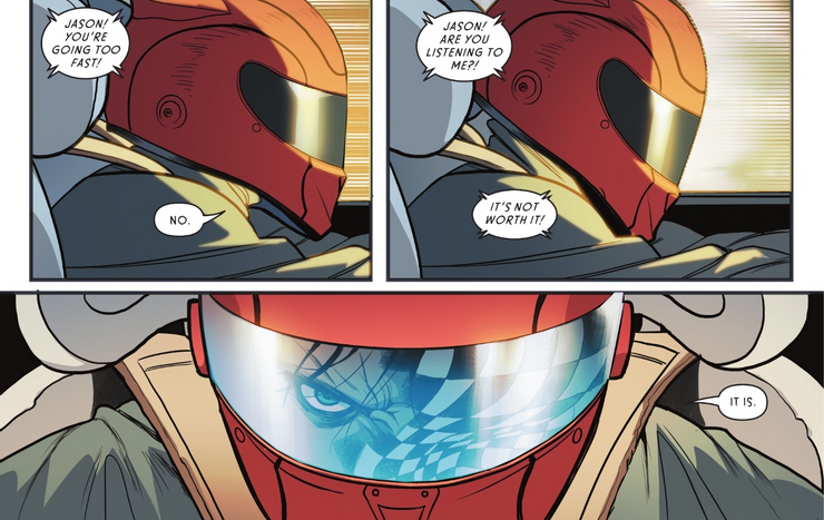 Petirrojos #5 de Tim Seeley y Baldemar Rivas ve a cada Robin colocado en una simulación. Creado por Tim Drake utilizando la evaluación de Batman de cada Robin y sus estimaciones de dónde estarían si no lo hubieran conocido, Jason Todd se encuentra como piloto de carreras en Gotham Speedway, ganando un premio en metálico para apoyar al Centro de Recuperación Catherine Todd. . Si no se hubiera convertido en Robin, Jason probablemente habría dedicado su vida a la singular misión de evitar que otros sufran de la misma manera que su madre. Sin embargo, este nuevo número también revela que la dedicación intransigente de Jason a esta misión habría resultado ser su perdición, ya que comienza a robar autos cuando deja de ganar carreras (lo que lo lleva a la cárcel). Como tal, este escenario de “¿Qué pasaría si?” demuestra que Jason comparte con Bruce lo que podría decirse que es el rasgo más central de ser Batman: el fanatismo.