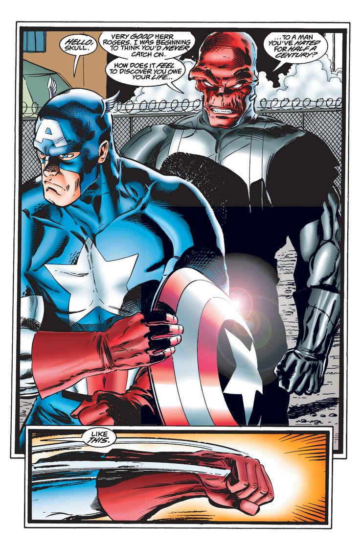 En verdad, su cuerpo desaparece misteriosamente de la Mansión de los Vengadores. En el siguiente número, el Capitán América se despierta en un laboratorio, donde se le ha realizado una transfusión de fluidos corporales totales, salvándole la vida. Para su consternación, Rogers descubre que la transfusión provino de Red Skull, quien es el único que podría salvarlo debido a que tiene su cuerpo clonado. Schmidt quiere la ayuda de Cap para luchar contra Kubekult, una facción de neonazis y miembros de AIM que han robado su cubo cósmico ornamental que contiene el alma de Hitler. Durante la pelea, el Capitán América salva la vida de Skull, que considera suficiente para pagarle la transfusión, pero lo cierto es que sin la ayuda de su peor enemigo, Steve Rogers habría muerto mucho antes de su famoso asesinato a finales de Guerra civil.