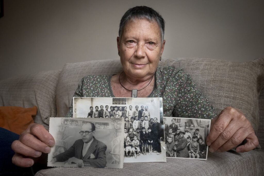 Àngels Buchaca, con fotografías de su padre, Elies Buchaca, un maestro “depurado” tras la Guerra Civil.Carles Ribas (EL PAÍS)