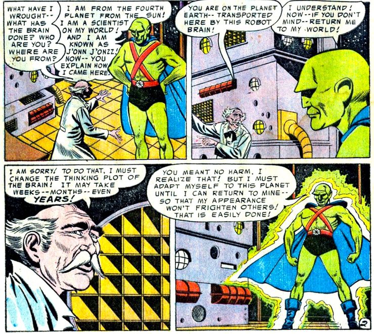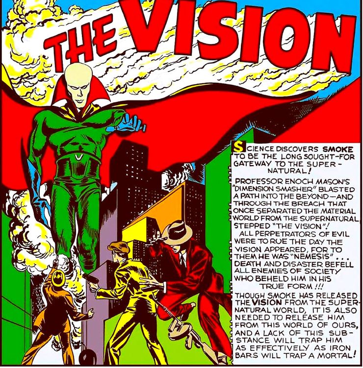 En 1955, doce años después de la cancelación de Vision, Cómics de detectives #225 presentaría a John Jones (J’onn J’onzz), el cazador de hombres de Marte, conocido por los lectores de hoy como el cazador de hombres marciano. Su debut ocurre en la historia “Manhunter from Mars: The Strange Experiment of Dr. Erdel” de Joseph Samachson, Jack Miller y Joe Certa. Al igual que Vision, Martian Manhunter es convocado por un científico que espera hacer contacto con nuevos mundos. Más tarde toma una forma humana para mezclarse y comienza a luchar contra el crimen, e incluso se une a la policía local. Al igual que Smokeworld, Mars no ha experimentado una guerra en mil años y ha evolucionado completamente más allá del crimen. Tanto Vision como Martian Manhunter incluso toman nota de lo extraños que encuentran los rascacielos. Incluso los diseños son similares, con ambos seres representados con cara de piedra y calvos con piel verde y capas dramáticas que fluyen. A principios de la década de 1940, la idea de un extraterrestre verde como héroe estaba un poco adelantada a su tiempo, pero al concepto le fue mucho mejor en la parafernalia de ciencia ficción de la era atómica de la década de 1950.