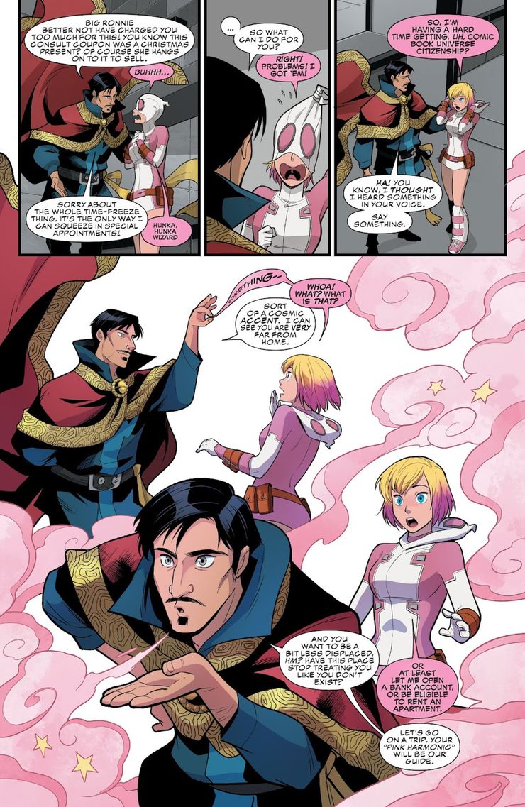 Gwenpool, también conocida como Gwendolyn Poole, es una fan de Marvel del “mundo real” que fue misteriosamente transportada a la Tierra-616. Al igual que Deadpool, Gwen es conocida por sus travesuras y meta humor que rompen la cuarta pared. Los caminos de Gwenpool y Doctor Strange se cruzan por primera vez en El increíble Gwenpool #3 por Christopher Hastings y Gurihiru. En este número, Gwen no puede obtener su cheque de mercenario de MODOK y necesita su ciudadanía de cómic de su antigua realidad. Strange inmediatamente se da cuenta de que Gwen es de una realidad diferente y usa sus poderes para transferir cada rastro de la existencia de Gwenpool a su nueva realidad. Está completamente en el ámbito de la posibilidad de que Doctor Strange reconozca a un personaje que salta de dimensión. Sin embargo, la forma en que reconoce que Gwen no es de Marvel’s Earth-616 pone en duda por completo la historia de fondo de Deadpool.