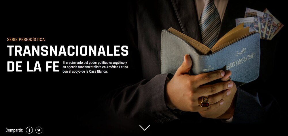 Coordinado por el Centro Latinoamericano de Investigación Periodística (CLIP) y Columbia Journalism Investigations, Transnacionales de la fe, publicado simultáneamente en agosto de 2019, se adentra en la influencia cada vez mayor que la Iglesia evangélica está consiguiendo en las esferas de poder de América Latina y cómo su agenda conservadora está dictando algunas de las políticas en estos países.