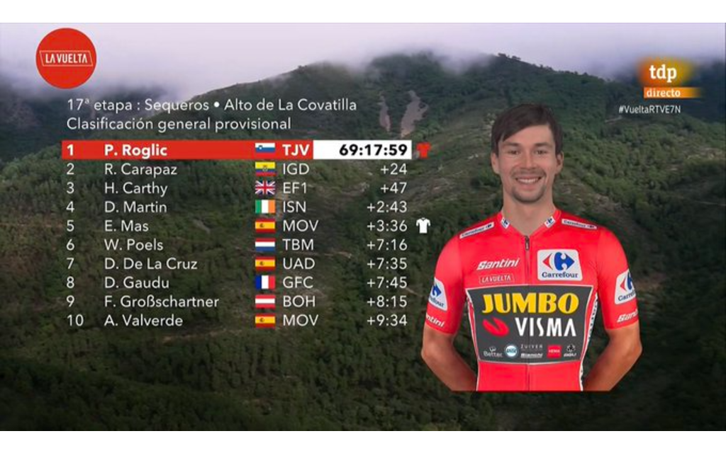Con ello, el líder retuvo el rojo y revalidará su título en la ronda española logrado el año pasado con 24 segundos de ventaja sobre Carapaz y 47 sobre el británico Hugh Carthy (EF Pro Cycling), que completarán el podio en Madrid, donde este domingo finalizará la última etapa de 139,6 kilómetros que partirá desde el Hipódromo de La Zarzuela.