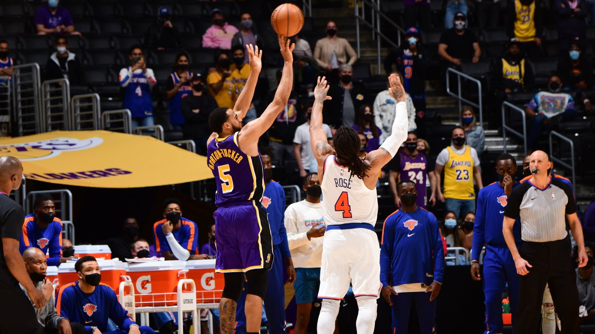 Los Knicks estaban 98-93 abajo a 1:56 del final de la prórroga pero anotaron seis tantos consecutivos para darle la vuelta a la pizarra, incluyendo un triple de Julius Randle a 1:11 de la chicharra final. En un juego con 23 cambios de líder, Horton-Tucker tuvo su gran momento cuando los Lakers más lo necesitaban. Convirtió siete de sus 13 puntos en el añadido.
