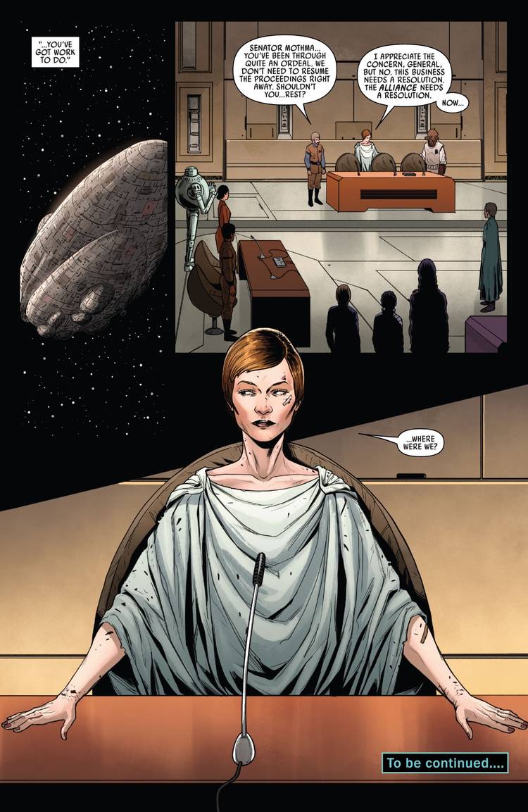 Como se ve al final de Guerra de las Galaxias #46 Por Charles Soule y Madibek Musabekov, Mon Mothma regresa de su reciente captura, después de haber sido secuestrada por Scarabi, quien había exigido un rescate más alto de lo que la Rebelión podía permitirse. En lugar de arriesgarse a que el Imperio ponga sus manos sobre el líder clave de la Rebelión, la Alianza organiza una desesperada misión de rescate para recuperar a Mothma. Sin embargo, El regreso de Mothma al juicio de Lando nunca hubiera sido posible sin el propio Lando en este nuevo número.