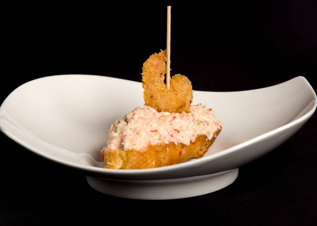 No podía faltar en la cuna de la gilda. Aquí, la tradición manda: surimi, mayonesa y gamba cocida sobre rodaja de pan blanco. Y más mayonesa por encima, por si faltaba. Básico y clásico donde los haya. Si lo probaste hace 15 años, sigue sabiendo igual.