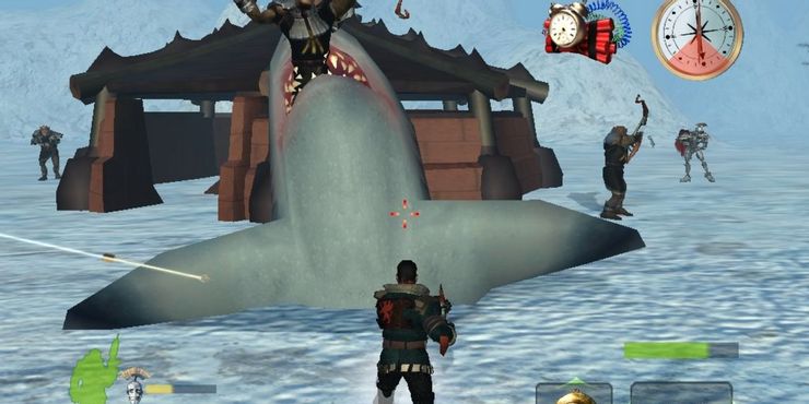 El Land Shark Gun es el ejemplo perfecto que muestra por qué Armado y peligroso es uno de los videojuegos de comedia más divertidos de todos los tiempos. Es exactamente lo que parece, ya que permite a los Lionhearts matar a sus enemigos de una manera dramática.