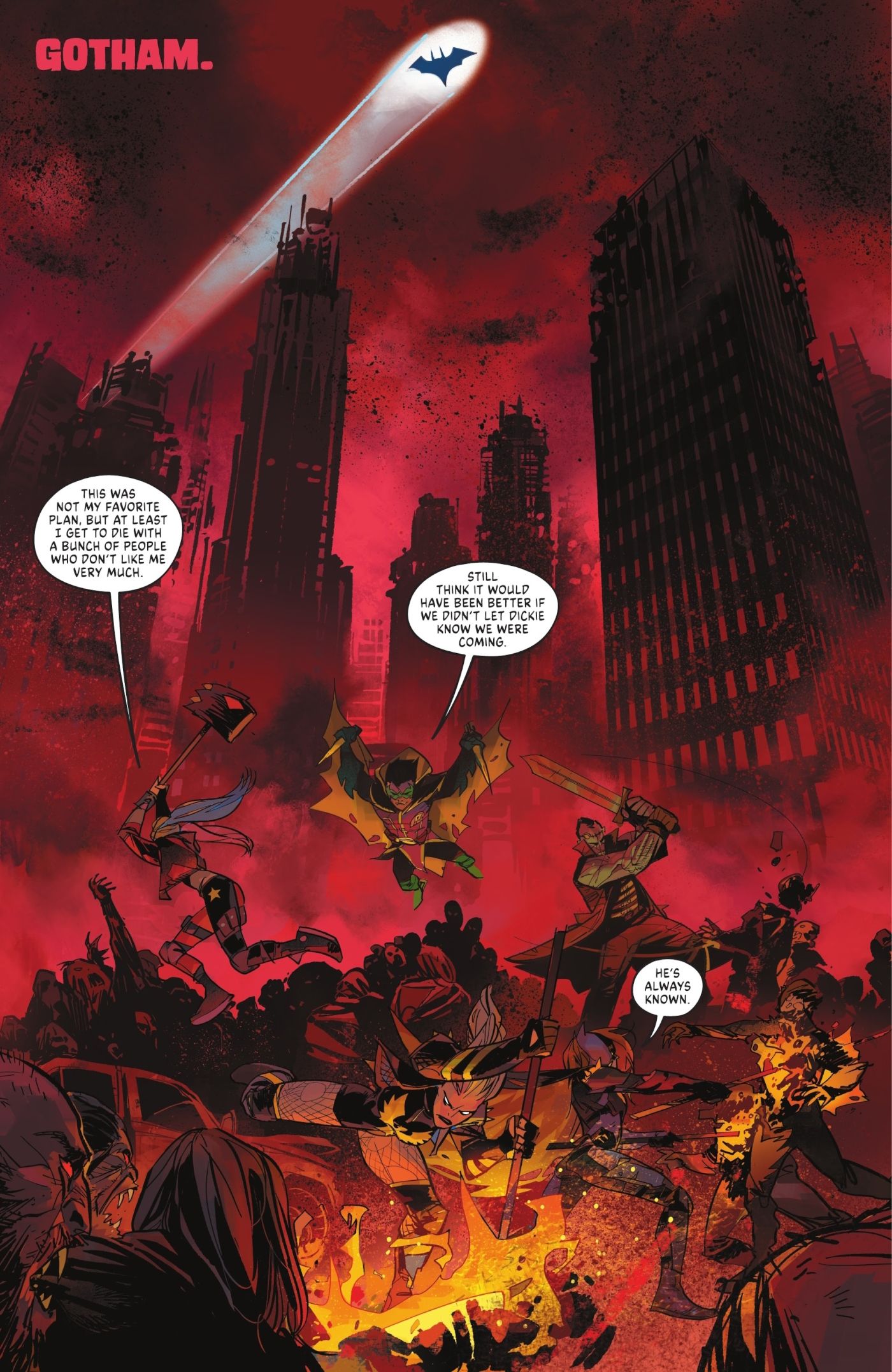 “/> Otro universo retorcido que adopta un enfoque diferente al DCejado es DC contra vampiros. en lugar de un inmediato Apocalipsis, esta historia sigue un apocalipsis silencioso en el que la Liga de la Justicia se convierte lentamente en vampiros junto con todos los demás y el mundo se pierde antes de que nadie se dé cuenta. Esto finalmente culmina cuando los últimos supervivientes de la humanidad lanzan un ataque a gran escala contra Nightwing, el Rey de los Vampiros que orquesta la caída del mundo. Queriendo matar a Nightwing de una vez por todas, Batgirl lidera una versión final heterogénea de la Liga de la Justicia contra el reino de Nightwing en las ruinas de Gotham City. Este enfrentamiento final se vio en DC contra vampiros #6 de James Tynion IV, Matthew Rosenberg, Otto Schmidt, Francesco Mortarino, Pierluigi Casolino y Tom Napolitano.
