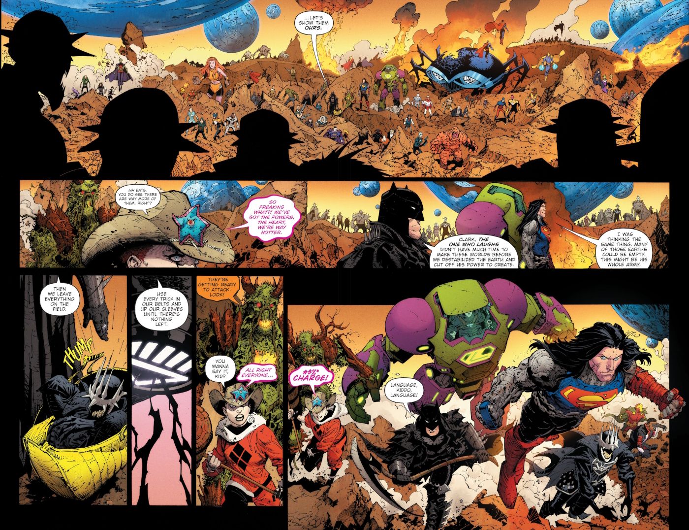 La guerra final por el Multiverso se puede ver en Noches oscuras: Death Metal #6 de Scott Snyder, Greg Capullo, Jonathan Glapion, FCO Plascencia y Tom Napolitano. Esta guerra no es sólo por el destino de un planeta, sino por el destino de todo planetas. Concluyendo con la expansión del Multiverso DC a un Omniverso y el lanzamiento de DC’s frontera infinita era, esta es sin duda la Liga de la JusticiaLa mayor batalla.
