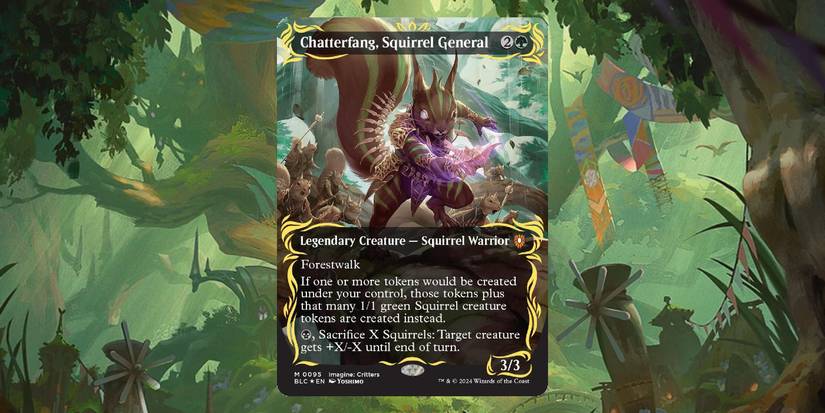 Chatterfang, general ardilla es otra incorporación a las opciones de tipo de criatura para los comandantes, y es una muy poderosa. Chatterfang escupe fichas de ardilla 1/1 con facilidad, sin siquiera requerir que su efecto se active con fichas de criatura específicas: cualquier ficha servirá. Si bien este estilo artístico de Chatterfang es ciertamente amenazante, también es una excelente representación de cómo se vería un guerrero ardilla en un plano de anime. Reproductor TCGP Actualmente muestra a Chatterfang, Squirrel General a un precio de mercado de $216.69.