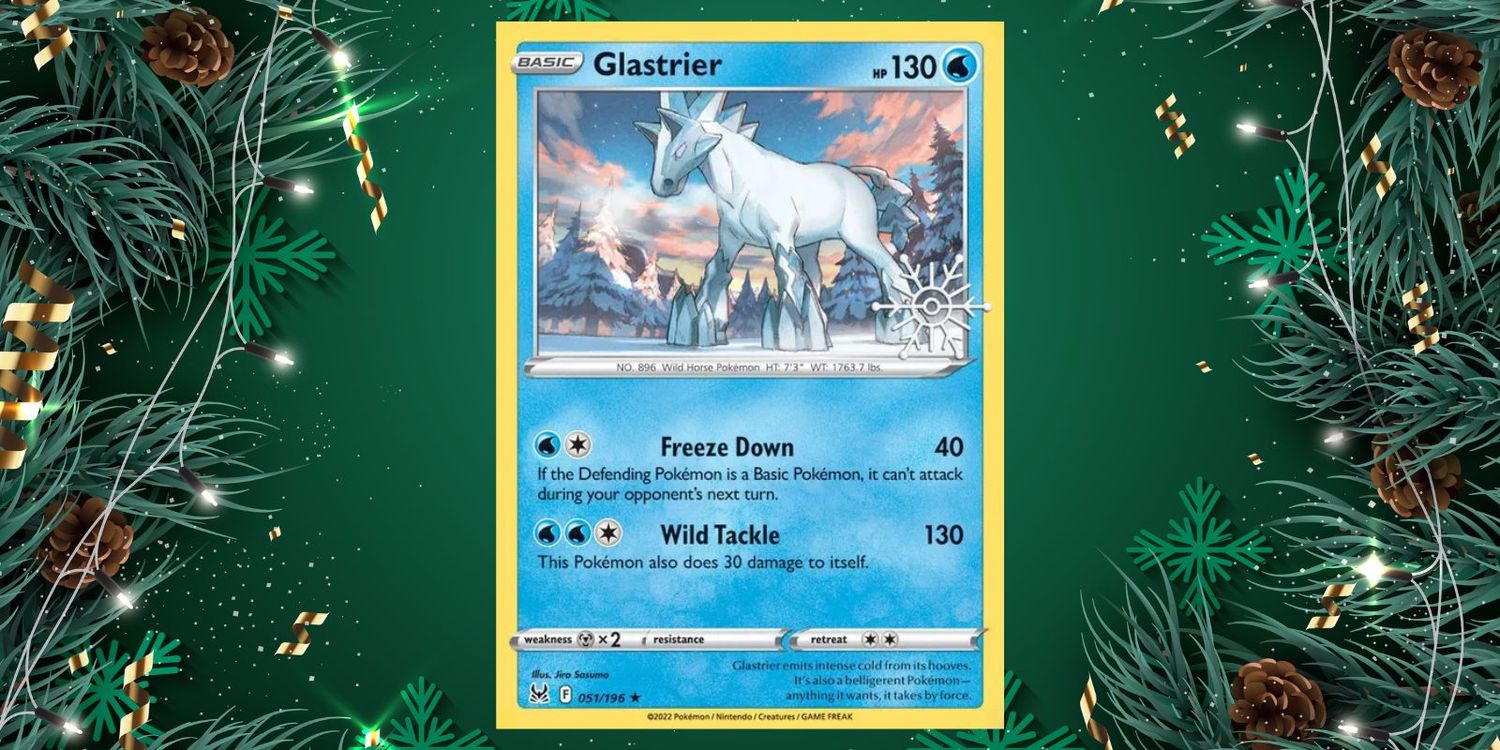 “/> El hermosa escena invernal de árboles de hoja perenne cubiertos de nieve en la distancia con el resplandor rosado del amanecer le da a esta carta Pokémon caballo salvaje una sensación de una tranquila mañana de vacaciones. Esta tarjeta Glastrier era la tarjeta 051/196 de Pokémon TCG: Espada y Escudo – Origen Perdido antes de ser reimpreso con el sello del copo de nieve para las promociones del Calendario navideño. En este momento, TCGPlayer está listando la tarjeta navideña Glastrier a un precio de mercado de $1.26 USD.