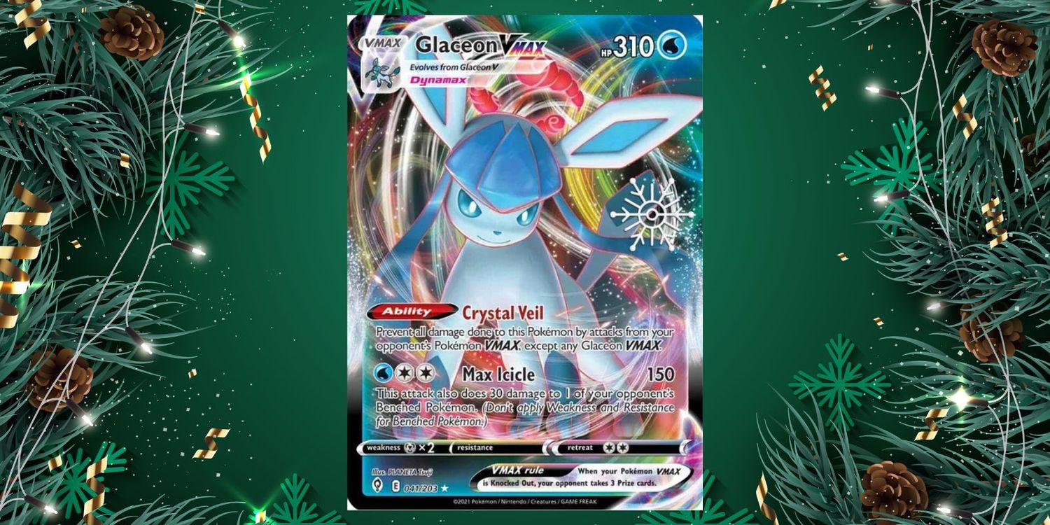 “/> La evolución glacial de Eevee, el favorito de los fanáticos, es una hermosa tarjeta para el Pokémon TCG Promociones del calendario festivo. Esta tarjeta para Glaceon VMAX no solo tiene estampada el copo de nieve navideño, sino también su Los remolinos de luces de colores que se ilustran en esta tarjeta con arte completo podrían interpretarse fácilmente como luces navideñas. en movimiento. La tarjeta Glaceon VMAX 041/203 es una reimpresión de la Espada y escudo: cielos en evolución set, y esta versión promocional navideña se muestra en TCGPlayer con un valor de mercado actual de $3.10 USD.
