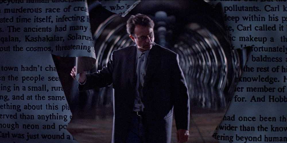 En una escena de bravura, el protagonista de Sam Neill, Trent, se entera de ese autor Sutter Cane (Jürgen Prochnow) está tratando de romper la barrera entre la realidad y la fantasía para que los “viejos” puedan regresar. Cane luego se destroza para que los monstruos del vacío puedan llegar al mundo real.