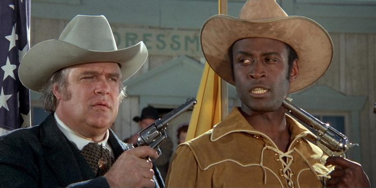 Bart señala lo absurdo de los prejuicios de la gente del pueblo sosteniéndose a punta de pistola y amenazando con dispararse. Cleavon Little interpreta la escena maravillosamente.