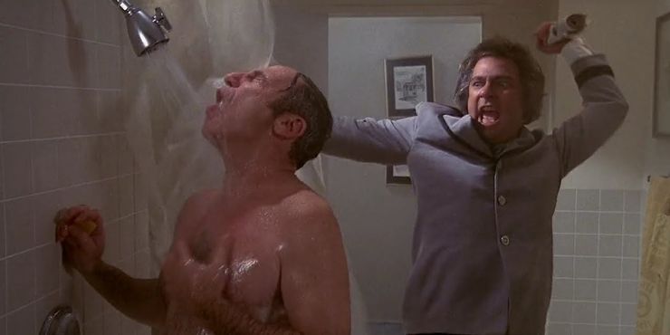Ninguna parodia de Hitchcock estaría completa sin una referencia a PsicópataAsesinato en la ducha. En Alta ansiedad, en lugar de morir apuñalado en la ducha, Brooks es golpeado con un periódico enrollado.
