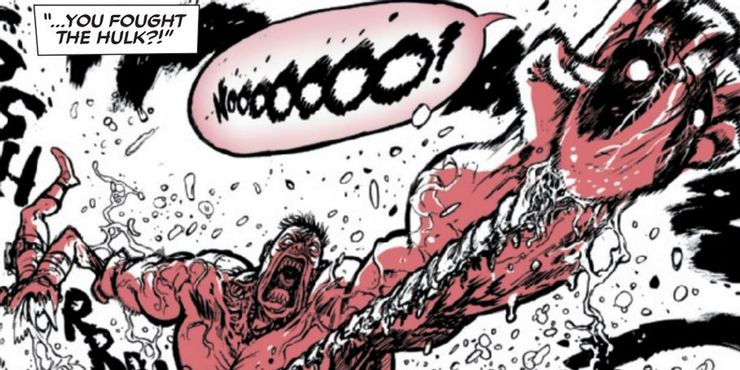En un raro momento de inteligencia, Deadpool le permite a Hulk pensar que murió y espera a que el gigante verde se aleje. Debe haber sido difícil pensar en un buen plan en piezas como esa. Después de recomponerse, encuentra a Hulk nuevamente, esta vez como Bruce Banner, y espera a que se despierte antes de cortarle la cabeza en un sentido retorcido de ironía.