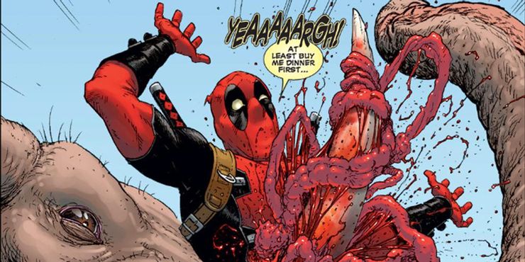 Sin embargo, no puede contraatacar de la manera habitual, ya que le quitaron las armas y lo desnudaron. Como resultado, recurre a medidas drásticas: morder uno de sus brazos. Teniendo en cuenta que no pareció tardar mucho en separarse el brazo, Deadpool debe haber sabido exactamente dónde morder para quitárselo rápidamente antes de que los alienígenas pudieran detenerlo. Aparentemente, los tiempos desesperados requieren medidas desesperadas.