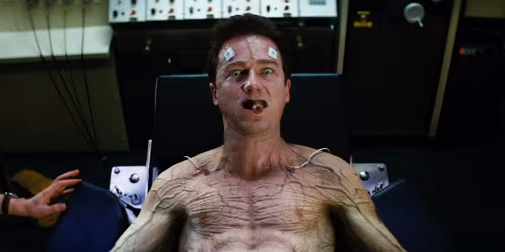 Los huesos se tuercen, los músculos se estiran de forma antinatural y Bruce grita de miedo y dolor. Es El horror corporal llevado directamente al cine de superhéroes. El momento dramatiza cuán traumática es la experiencia para Bruce. Su lucha por resistir sólo hace que la transformación sea más inquietante.