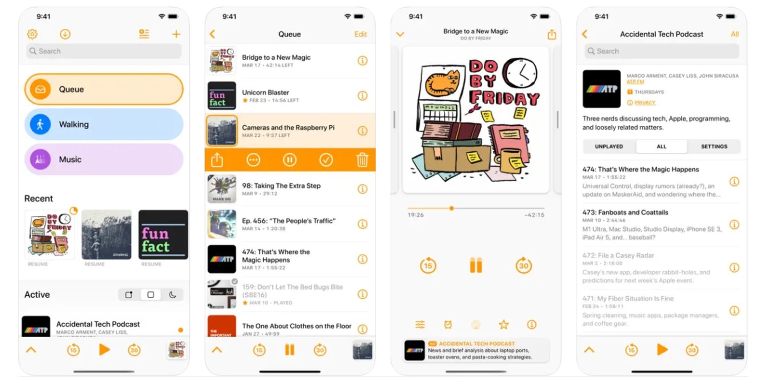 El primero en la lista es una aplicación de podcast disponible para iOS. Castro Podcast Player solicita a los usuarios que se suscriban a sus podcasts favoritos mientras se registran. La aplicación contiene cuatro secciones, incluida la Cola, que almacena todos los episodios que los usuarios están escuchando, y la Bandeja de entrada, donde la aplicación sugiere ciertos programas de audio según las preferencias de los usuarios. Luego están las secciones Biblioteca y Descubrir, para programas a los que el usuario se ha suscrito y para encontrar contenido nuevo.