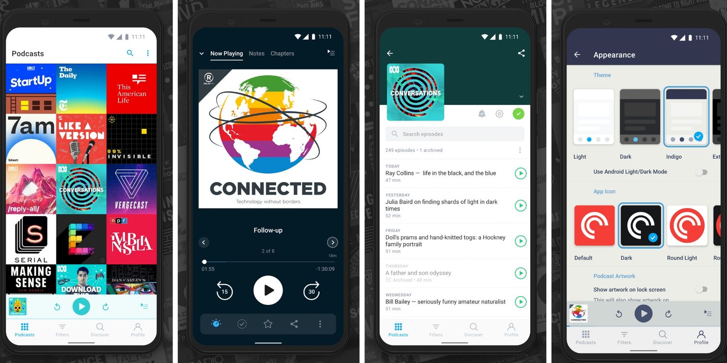 Lo que es único de esta aplicación es que permite a los usuarios configurar filtros según la fecha de lanzamiento, la duración, el tipo de medio, las calificaciones y más. La versión gratuita de la aplicación contiene funciones como control de velocidad de reproducción, Trim Silence, Volume Boost y Sleep Timer. Pocket Casts tiene una selección bastante grande de episodios de audio para transmitir.