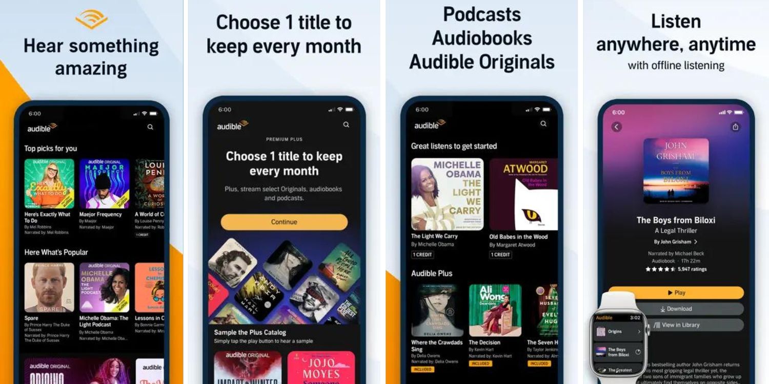 Audible ofrece podcasts y audiolibros. La aplicación tiene más de 1,4 millones de reseñas de usuarios en Play Store con un promedio de 4,2 estrellas y más de 26.000 valoraciones en App Store con 4,8 estrellas. La aplicación alberga más de 500.000 títulos, incluidos audiolibros y podcasts de ficción y no ficción de varios géneros. Sin embargo, Audible no ofrece tantos títulos gratuitos como otras aplicaciones de esta lista.