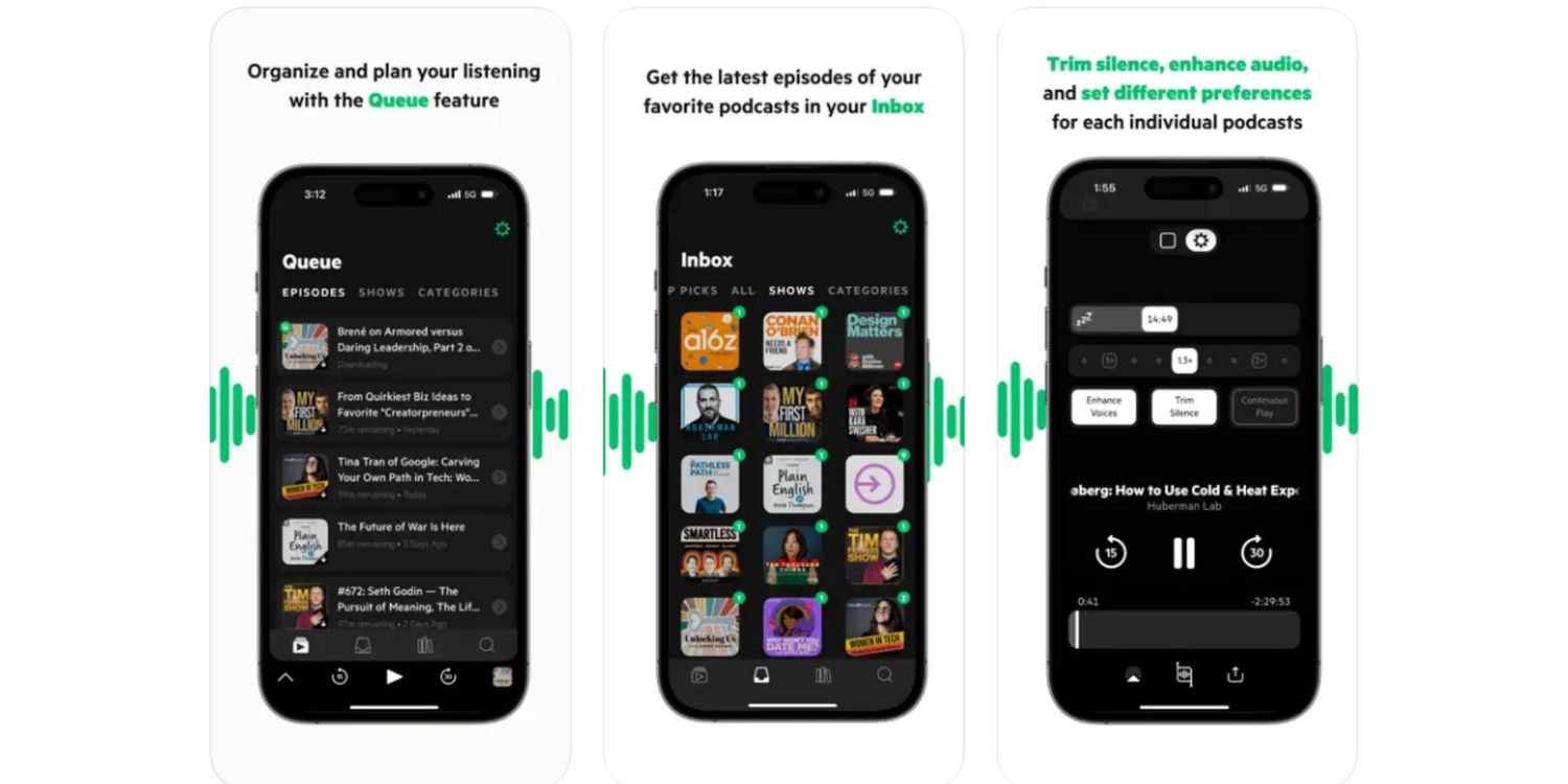 La versión gratuita de la aplicación permite a los usuarios escuchar a velocidades de 1x o 2x, buscar hacia adelante y hacia atrás e incluso compartir breves clips de podcasts con amigos. La versión premium de la aplicación permite a los oyentes reducir el silencio, omitir introducciones y mejorar las voces. Cuesta $19,99 por año.