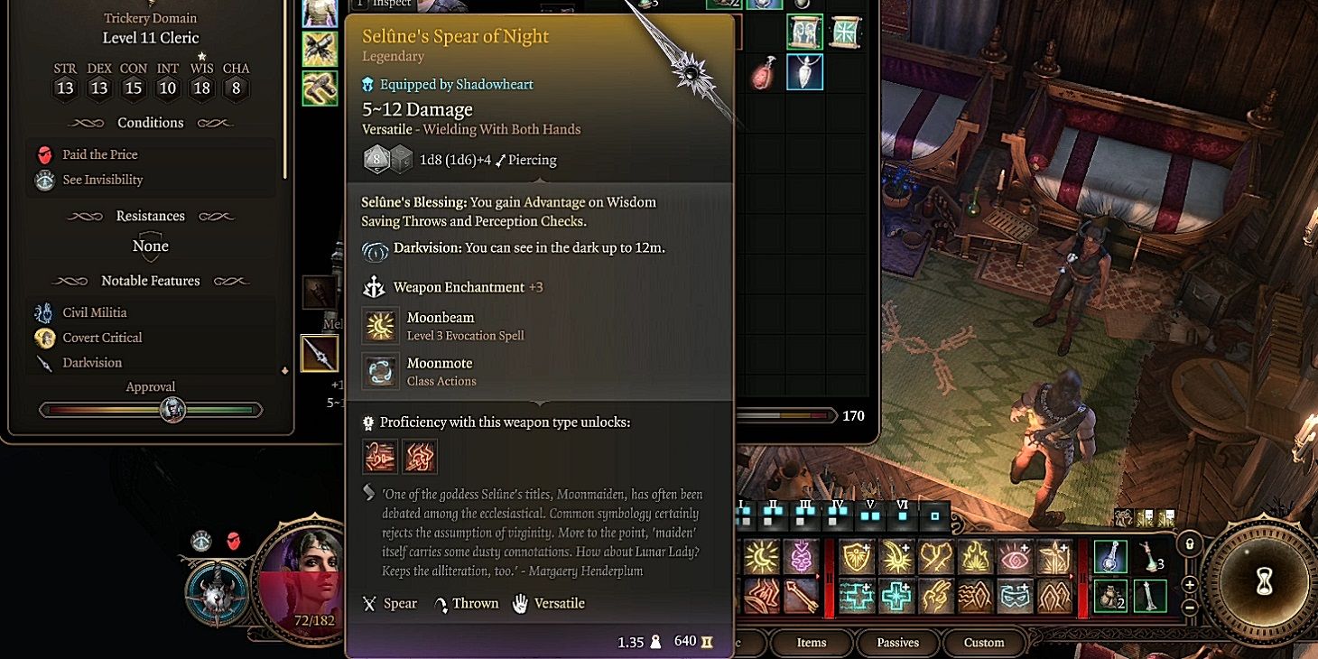 La Lanza de la Noche de Selûne es una lanza increíble y versátil que causa 1d8 más tres más un modificador de Fuerza. Sin embargo, la verdadera fuerza de Selûne’s Spear of Night reside en las cuatro características adicionales. Además de brindarle al portador visión en la oscuridad de hasta 12 metros/40 pies, La Bendición de Selûne da ventaja en las pruebas de Percepción y en todas las tiradas de salvación de Sabiduría..