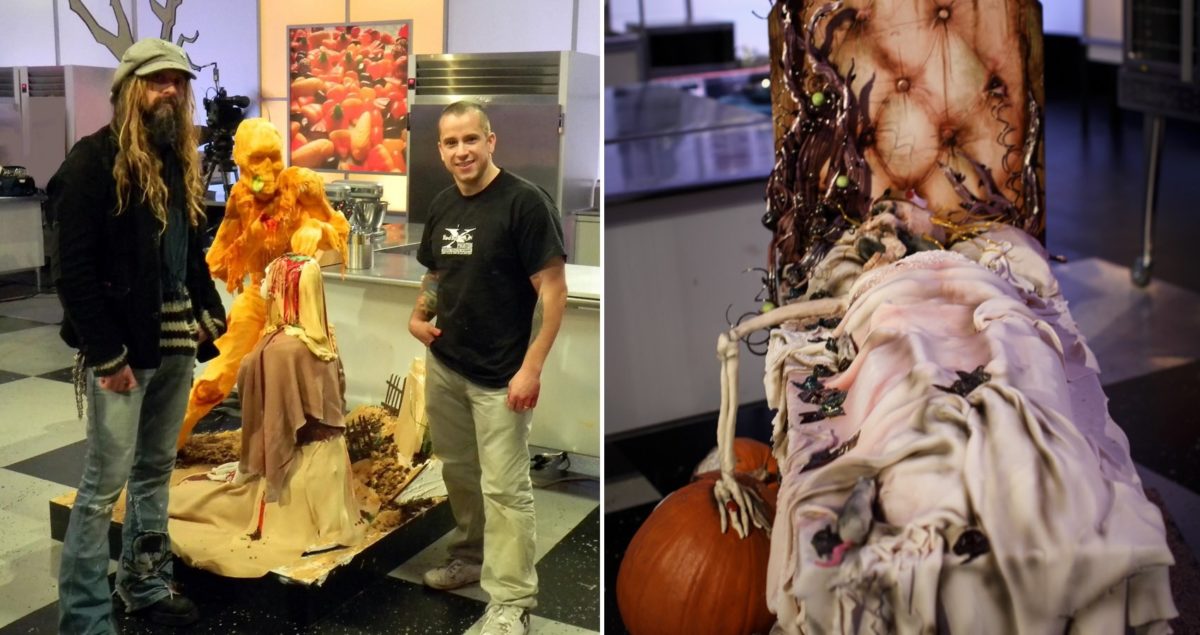 Los Bling Bats decidieron ofrecer una versión más civilizada del asunto. Su escena presentaba una increíble muestra de chocolate, azúcar y calabaza, tallada en una versión de un vampiro inspirado en María Antonieta, comprometida en una lucha feroz con un zombi harapiento de la misma época.