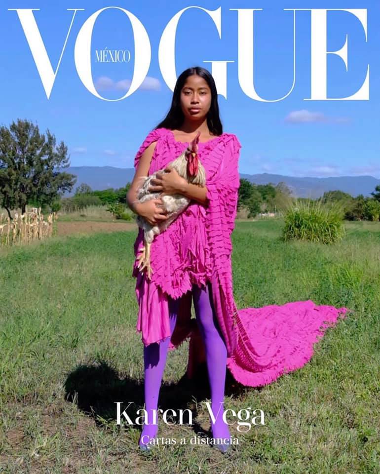 La publicación la describe como: “La primera modelo oaxaqueña llega a la historia de portada de Vogue julio. Ella es Karen Vega, una joven con muchos sueños que cumplir y paradigmas por derribar”.