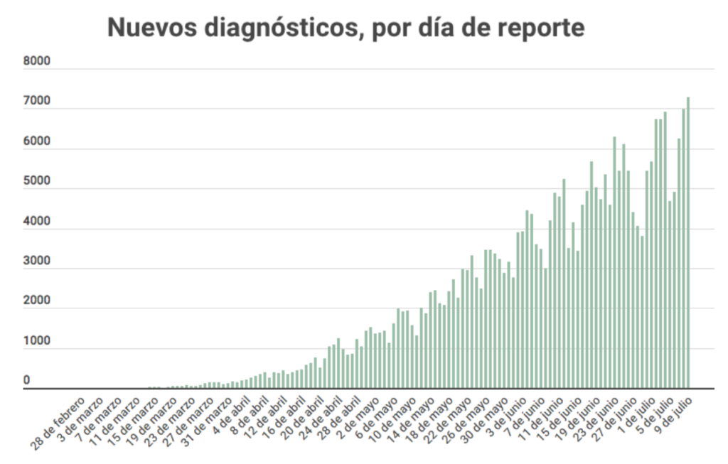 En esta gráfica se presentan los diagnósticos confirmados de Covid-19 por fecha de publicación, por lo cual se observa que este miércoles y jueves se presentaron los dos registros máximos de casos reportados en un solo día. Por lo que si puedes, lo recomendable sigue siendo quedarte en casa.