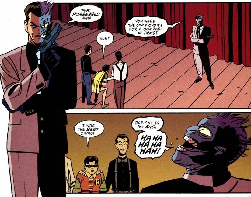 Algunos críticos restan importancia al reclutamiento de Dick Grayson en la Bat-Familia al sugerir que lo reclutaron solo porque Batman se sentía muy solo. Esto implica que cualquiera podría haber ocupado el lugar de Dick, y que él estaba en el lugar correcto en el momento correcto. Two-Face hace una insinuación similar en Robin: Año unoy Dick se apresura a corregirlo. Dick no es Robin sólo porque Bruce Wayne lo acogió. Es porque era el mejor candidato posible para ser Robin.