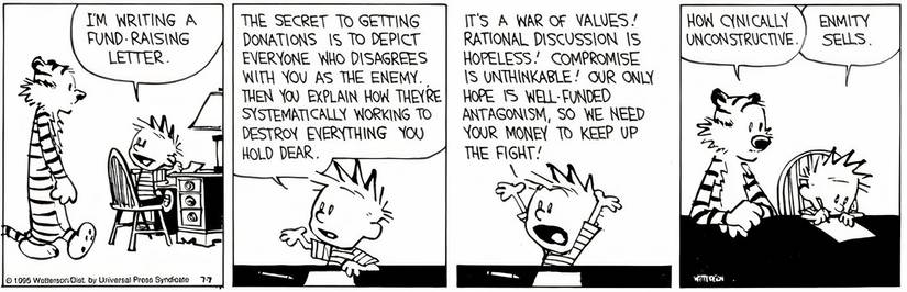 Calvin comprende las complejidades de un sistema que utiliza el miedo para conseguir apoyo para cualquier causa (principalmente política). Y en este cómic, decide utilizar ese conocimiento a su favor. Calvin está recaudando dinero para una recaudación de fondos y, para ello, elabora una narrativa falsa de una guerra contra la ética.diciéndoles a quienes les pide dinero que si no lo apoyan, su forma de vida estaría en peligro.