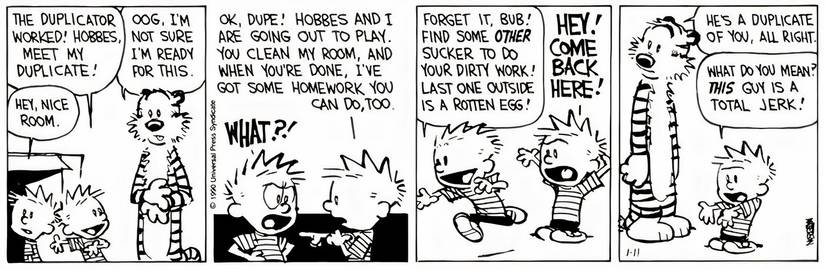 Calvin ha inventado una gran cantidad de dispositivos imaginarios que pueden hacer cualquier cantidad de cosas imposibles, incluido uno llamado Duplicador, que tiene el poder de crear clones perfectos de cualquiera que lo use. En este caso, Calvin usa el Duplicador para crear a “Dupe Calvin”, de modo que su clon pueda hacer todas las cosas que Calvin no quiere hacer, como las tareas domésticas y los deberes.
