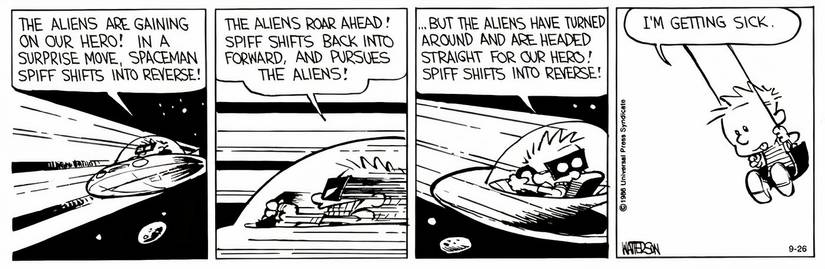 Mientras finge ser el astronauta Spiff volando por el espacio, Calvin está literalmente en un columpio, haciendo creer que el columpio es su nave espacial. Es decir, hasta que… El juego se vuelve demasiado intenso, lo que obliga a Calvin a salir de su mundo imaginario y admitir que “Me estoy enfermando“Los chistes de Spaceman Spiff siempre son divertidos. Calvin y HobbesY debido al remate, este es completamente hilarante.