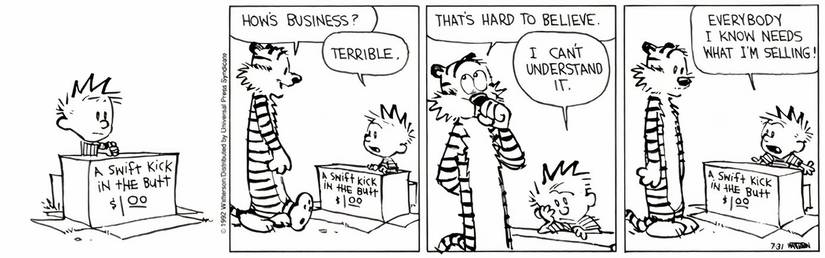 Como era de esperar, el negocio de Calvin no va muy bien. Calvin le dice a Hobbes que no ha hecho ni una sola venta y que no entiende por qué, porque… según Calvino – “¡Todos los que conozco necesitan lo que vendo!“Este es probablemente el chiste más histéricamente identificable de toda la serie, por eso es un claro destacado.