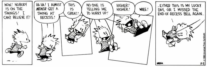 Un día, durante el recreo, Calvin se emociona al ver que los columpios están totalmente disponibles, sin un solo niño que los use o esté esperando para usarlos. Corre hacia ellos y salta en un columpio, gritando que nunca tiene tanta suerte durante el recreo. Pero entonces, se da cuenta de que puede haber una razón por la que no hay niños que usen los columpios. La emoción desapareció de su rostro y Calvin se dio cuenta de la aterradora posibilidad: “Me perdí otra vez el timbre del final del recreo“.