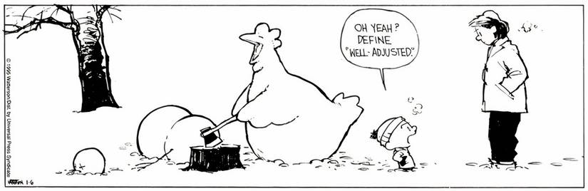 La tira cómica es un solo panel, que muestra a Calvin defendiendo su arte ante su madre, diciendo: “¿Ah, sí? Defina “bien adaptado”“, que es una respuesta a la pregunta de su madre sobre por qué Calvin haría algo así. Este remate es especialmente hilarante, ya que la introducción es completamente visual e implícita, pero aún así tiene el mismo impacto que el más divertido. Calvin y Hobbes chistes