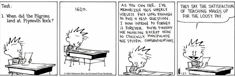 Calvin es un niño increíblemente inteligente, pero lo es de una manera que usa su inteligencia para evitar aprender cosas por completo, aunque de todas formas obtenga buenas calificaciones. Y durante un examen, Calvin se lo restriega en la cara a su maestra. Calvin responde correctamente sin problema, pero luego agrega una pequeña nota debajo. La nota dice que solo memorizó este hecho para responder correctamente en un examen y que lo olvidará pronto después, criticando su sistema educativo y básicamente diciéndole a su maestra que en realidad no le enseñaron nada.