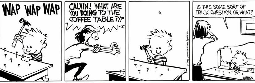 Calvin siempre es un pequeño alborotador y le sorprende sinceramente que su madre no se haya acostumbrado a eso, especialmente en este cómic. Calvin está clavando clavos en la mesa de café con naturalidad cuando su madre corre hacia él y grita: “¿¡Qué le estás haciendo a la mesa de café?!?“, a lo que Calvin responde con el hilarante remate: “¿Es esto algún tipo de pregunta capciosa o qué?“.