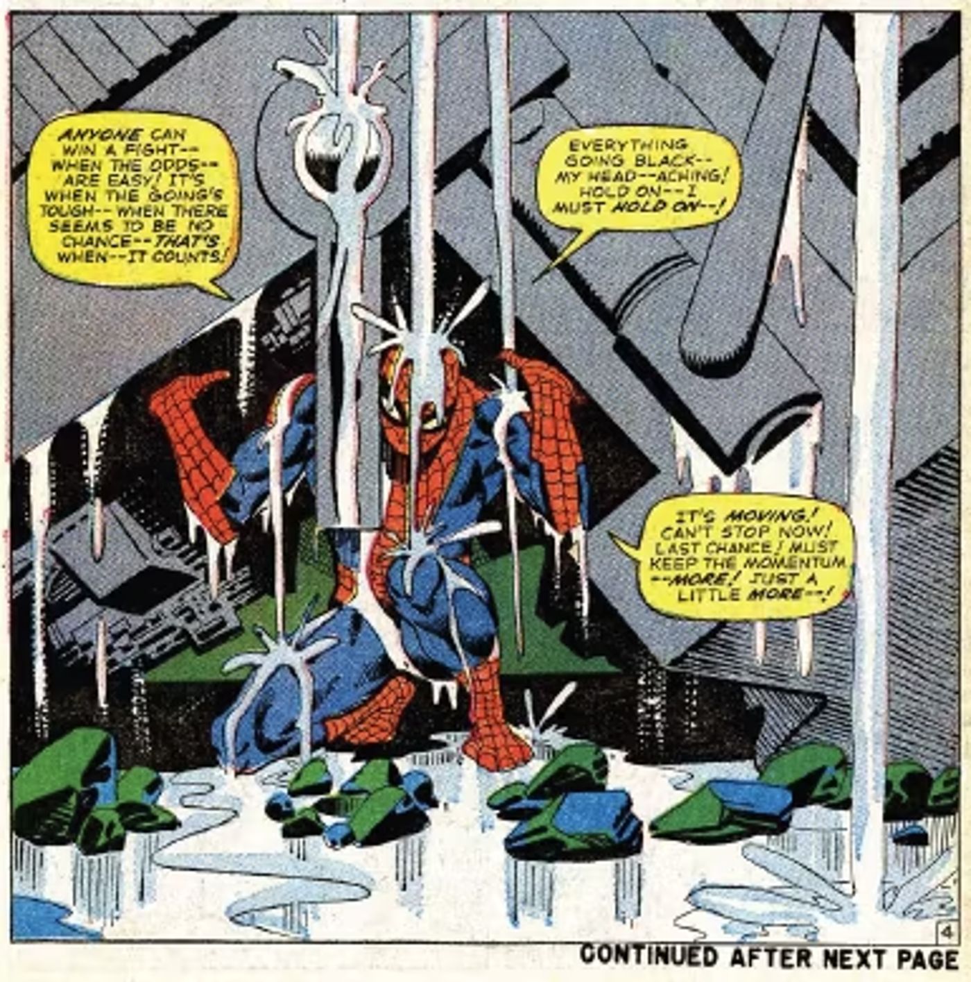 El primer arco narrativo interconectado en la historia de Spider-Man es también la historia más emblemática de Spider-Man. También conocida como la historia de “The Master Planner”, este arco de tres partes de Stan Lee y Steve Ditko ve a Spider-Man perseguir al supuesto “Master Planner”, que tiene un suero que puede salvar a su moribunda tía May. En una revelación impactante, el Master Planner no es otro que Doctor Octopus. Después de una pelea épica, Spider-Man queda atrapado bajo una gigantesca pieza de maquinaria en el escondite de Doc Ock, que lentamente se está inundando de agua y a punto de ahogarlo. Esto lleva posiblemente al momento más importante en la historia de Spider-Man, con el héroe saliendo de los escombros para salvar a la tía May. Con las palabras de Ben Parker resonando en su mente, Hombre araña se recuerda a sí mismo (y a los lectores) que siempre tendrá la fuerza para levantarse y salvar a sus seres queridos.