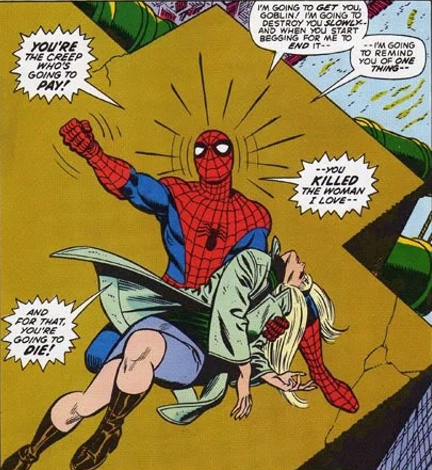 Uno de los momentos más impactantes e importantes de la historia de Spider-Man y de todos los cómics. Gerry Conway y Gil Kane crearon el arco argumental que cambiaría para siempre a Spider-Man con la muerte de Gwen Stacy. En una batalla climática con el Duende Verde, que ha descubierto la identidad de Spider-Man, Norman Osborn secuestra a la inocente novia de Peter, Gwen Stacy. En la escaramuza, Goblin arroja a Gwen por un puente, pero Spider-Man usa sus redes para atraparla a tiempo. Trágicamente, la telaraña de Spider-Man rompe accidentalmente el cuello de Gwen, matándola instantáneamente. Esta muerte inesperada fue el inicio no oficial de la Edad de Bronce de los cómicsuna era más oscura y serializada para los cómics.
