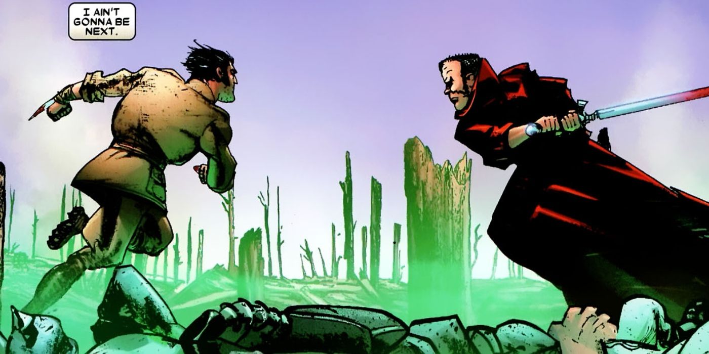Wolverine se enteraría más tarde de que este hombre se llamaba Lazaer, que en realidad era un anagrama de su verdadero nombre: Azrael, también conocido como el Ángel de la Muerte. Wolverine literalmente mató a la Muerte durante la Primera Guerra Mundialque es fácilmente la historia de guerra más genial que alguien pueda contar, lo que la convierte en la mejor de las 10 mejores. Glotón Historias de guerra en Marvel Comics.