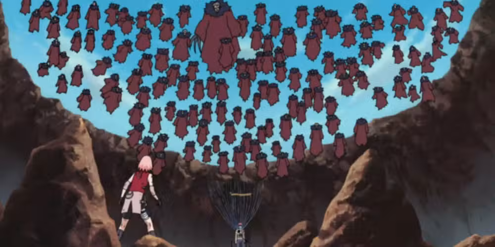 La llegada de Naruto a Hidden Leaf Village es uno de los momentos de mayor expectación en el anime. Llega encima de un sapo, que está encima de otro sapo, que está rodeado por dos sapos más. Naruto abre la pelea destruyendo uno de los Pains con un solo ataque y, de alguna manera, las cosas solo mejoran a partir de ahí.